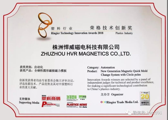 The magnetic quick mold change system developed and produced by HVR MAG is awarded the "2018 plastic industry - Ringier Technology Innovation Award".At this award ceremony, HVR MAG introduced the magnetic quick mold changing system to the industry, and helped the plastics industry 4.0!