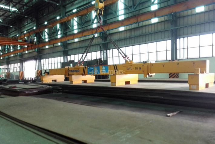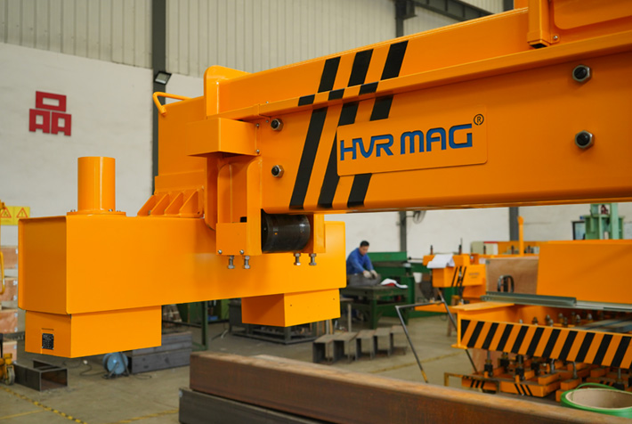 Сварная балка из конструкционной стали оснащена несколькими модулями с постоянными электромагнитами, которые упруго подвешены для идеального прилегания к стальному листу.